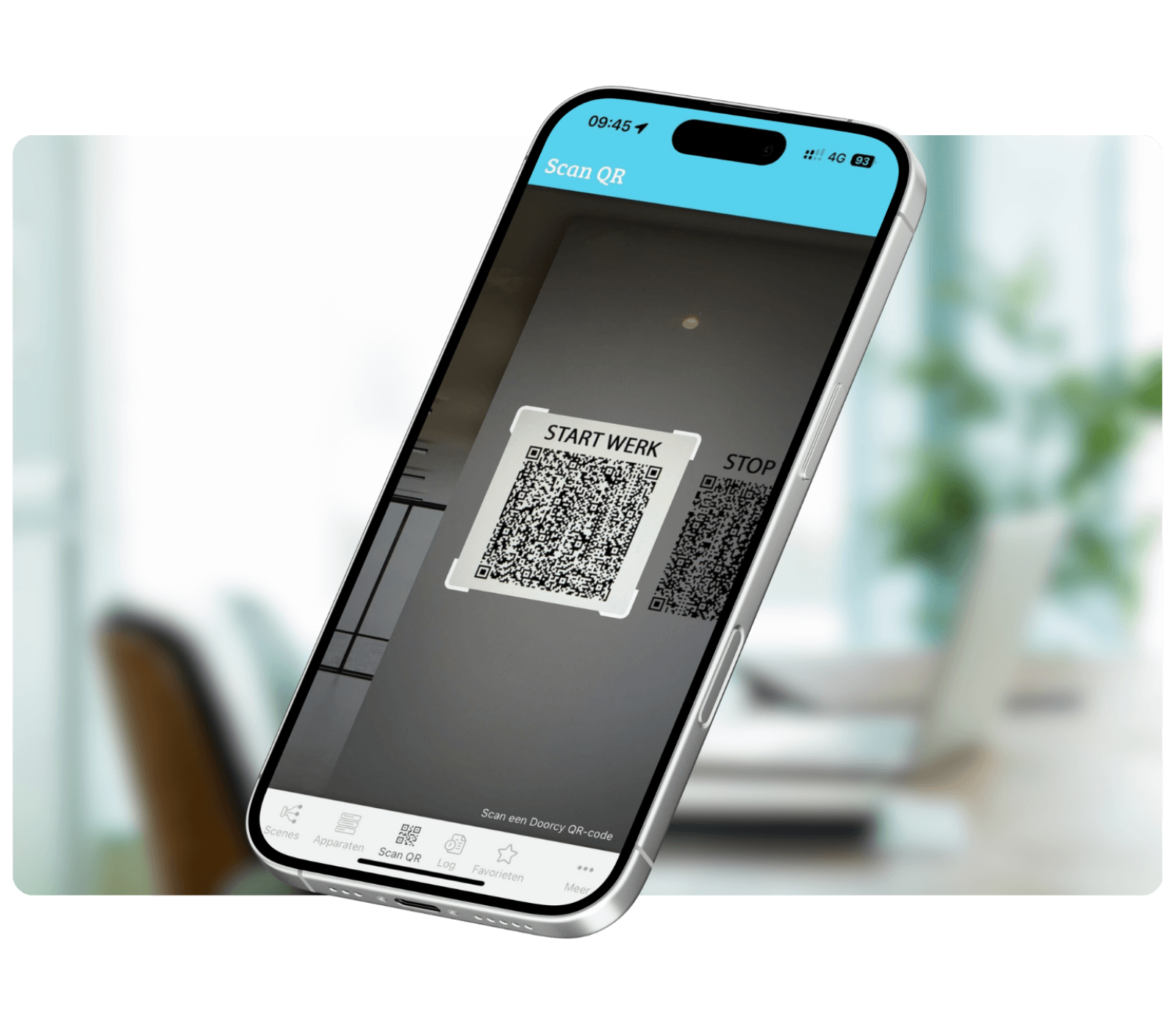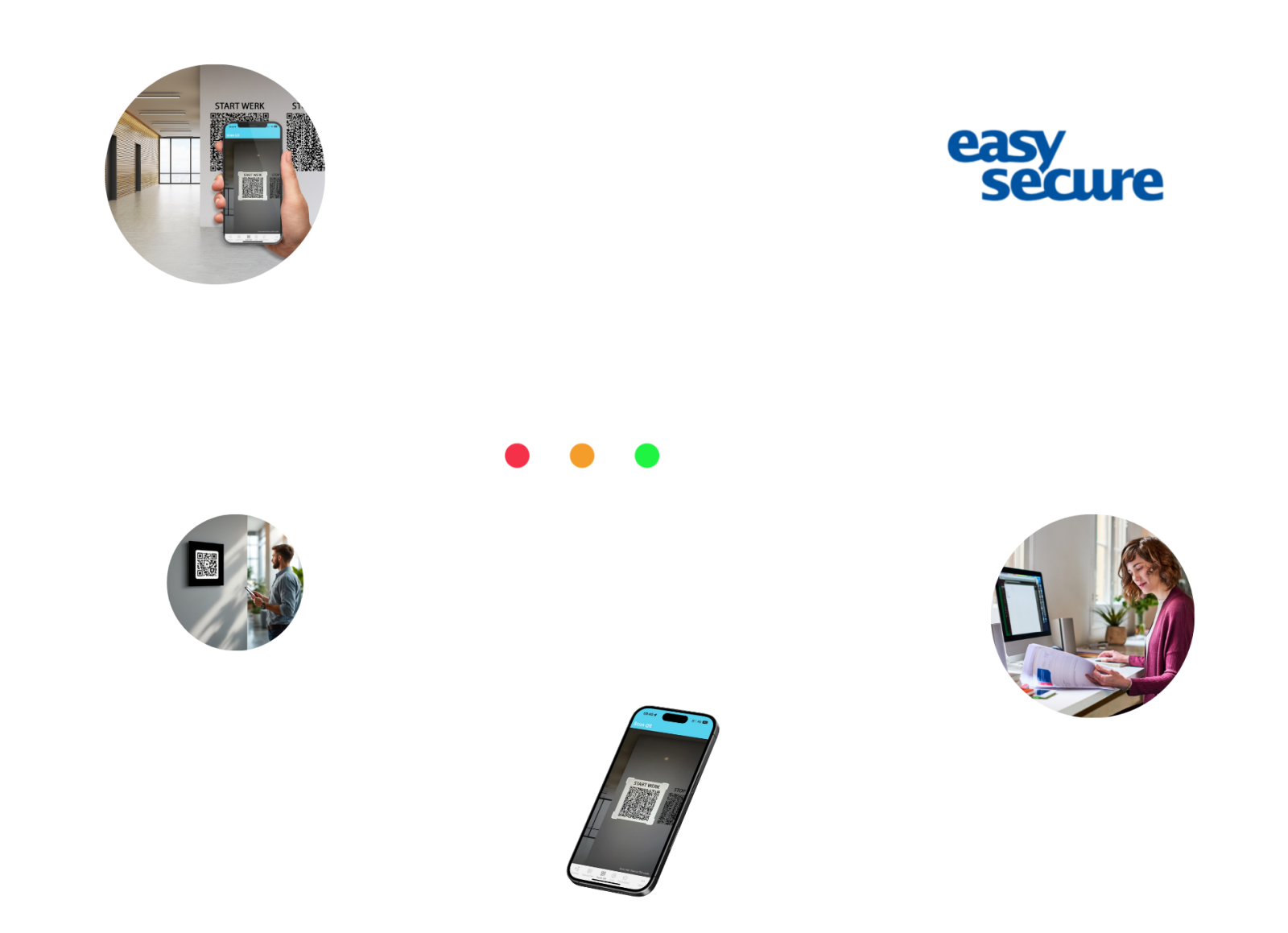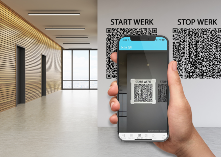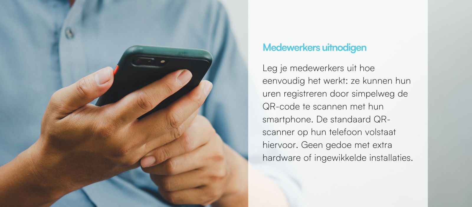 Scan de code bij binnenkomst, pauze of vertrek voor directe registratie.